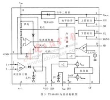 TEA1610是Philips公司推出的零電壓全諧振半橋控制器,是采用高壓DMOS工藝的芯片,高側開關管的驅動耐壓最大可達600V,最大的振蕩頻率達1MHz。其內部結構如圖5所示。