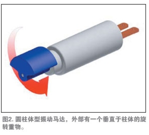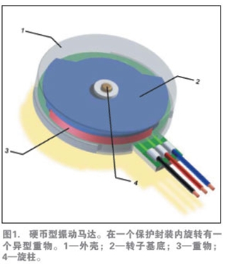 多數振動馬達由一個較小的電動馬達驅動一個偏心配重,如圖1所示。馬達分為直流有刷或無刷電機,有兩種基本的結構:硬幣狀(扁平)與圓柱形(條狀)。