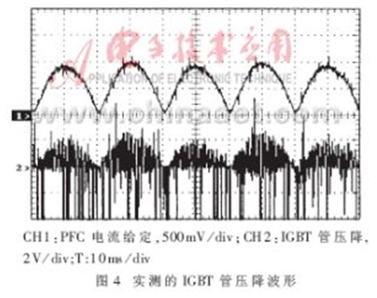 當(dāng)圖1所示的PWM變換器工作在單相高頻整流模式下,應(yīng)用PSPICE仿真軟件對(duì)圖2所示的電路進(jìn)行仿真研究,可以得到如圖3所示的結(jié)果。圖3所示的仿真波形相當(dāng)于在圖2電路中IC5B的第7腳觀察到的信號(hào)波形。仿真結(jié)果表明,檢測(cè)電路可以快速、有效地將PWM變換器的下管導(dǎo)通時(shí)的管壓降檢測(cè)出來(lái)。圖4所示波形是實(shí)際電路工作時(shí)檢測(cè)到的相關(guān)波形。圖中,1#通道顯示的是單相高頻整流電感電流的給定波形,2#通道顯示的是實(shí)際檢測(cè)到的圖2電路中IC5B的第7腳的工作波形。比較圖3和圖4可以得出,該檢測(cè)電路可以快速、有效地檢測(cè)出IGBT導(dǎo)通時(shí)的管壓降,從而對(duì)IGBT實(shí)施有效的保護(hù)。