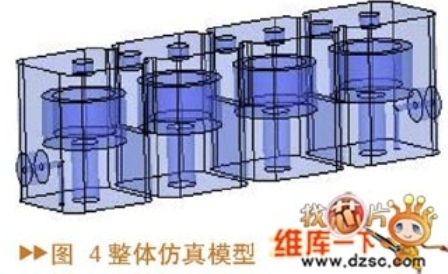 通過與前面計算的耦合系數理論值的比較,可以選擇合適的耦合孔及耦合螺釘的初始值建立整體仿真模型(圖4)。一般這種初始值進行整體仿真的結果與期望的濾波器指標有一定的偏差,通過調節耦合螺釘的深度、激勵的位置以及頻率調諧螺釘的深度可使濾波器達到期望的指標。