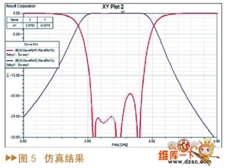 本文使用SIR結構設計濾波器,其通帶3976±20MHz內S21<1.5,S11>15,帶外抑制大于40dB(3976±60MHz)。濾波器的尺寸要求為:長×寬×高<50mm×15mm×15mm。
