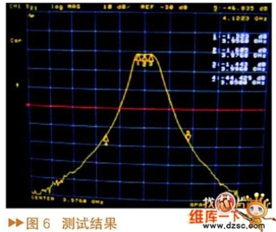 通過優化得到濾波器的仿真結果如圖5所示,在仿真過程中為了提高仿真速度,全部的材料都設置成理想材料,所以仿真結果中濾波器插損為零。實際測試的濾波器的波形如圖6所示,可以看出,該方法設計的濾波器實際測試的結果與仿真的結果非常吻合,能夠達到指標要求。