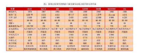 20世紀70年代以來,電力電子學和微電子技術的出現和進步,又重新喚起人們對交流傳動系統的熱情。自1971年世界首臺采用異步交流傳動系統的內燃機車DE2500問世以來,交流傳動系統以其突出的優越性受到了各國鐵路運輸部門的關注,獲得了長足的發展,并已基本取代了直流傳動系統。與直流傳動機車相比,交流傳動具有無可比擬的優越性,這已經在各國鐵路運輸系統中得到了廣泛的驗證。交流傳動所用的三相交流異步電動機比直流電動機的功率/體積比和功率/重量比更大,無需經常維護,故障率低。異步電動機的恒功率區比直流電動機大許多,轉速更高,起動牽引力大,持續功率大,有利于實現重載和高速牽引。交流傳動可以很容易地實現電氣制動,大大減少制動閘瓦的消耗,并可以利用制動時反饋的能量,起到節能節油的作用,經濟效益顯著。另外,交流傳動機車的一個突出的優點在于其優良的粘著特性,由于異步交流電動機變頻調速系統具有很硬的機械特性,車輪更不容易打滑或者空轉。其次,交流傳動電力機車牽引和再生工況的功率因數均接近于1,不僅降低了電網損耗而且在再生制動時可將高質量電能反饋給電網,消除了電網對信號和通信系統的干擾。再者,機車采用交流牽引電動機后,簧下重量大大減輕,改善了輪軌動力學性能,降低了機車輪緣磨耗。隨著磁場定向矢量控制和直接轉矩控制等高性能異步電動機控制策略的應用,交流傳動機車的調速性能已經能夠達到甚至超過直流傳動機車。表1是國外比較有代表性的使用交流傳動的電力機車和電動車組。