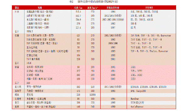 現在,越來越多的國家已經擁有了或者正在或者準備建設高速鐵路。截至2003 年底,世界上時速超過250km的高速鐵路運營里程已達到5 900km,還有近3 000km高速鐵路在建。計劃到2015年,世界上擁有高速鐵路的國家和地區將達到23個,總里程會達到30 000km,歐洲地區將形成高速鐵路網聯通。表2所列的是到2002年底國外正在運營的高速鐵路概括。