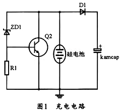 本系統中的充電電路由防過壓和防反充電路構成,圖1所示為其充電電路,圖中的ZD1為5.6V穩壓二極管,當電池電壓高于5.6 V時,Q2導通,硅電池全部電流通過電阻Q2消耗掉,當硅電池電壓降到5.6 V以下時,Q2截至,硅電池給超級電容充電,并同時保護超級電容。