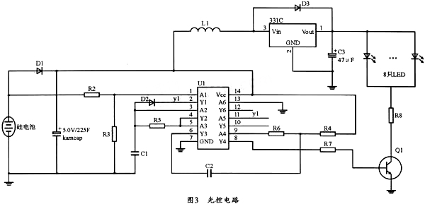 圖3中,U1為帶施密特觸發器的六反相器74HC14,其中的多諧振蕩器由第二個反相器與R5和C1構成。這樣,在白天光線變亮時,太陽能電池電壓升高,74HC14的1腳為高電平,74HC14的2腳為低電平,8腳同樣輸出低電平,三極管Q1截至,LED關斷。而當光線變暗時,太陽能電池電壓降低到一定程度時,HC14的1腳為低電平,HC14的2腳為高電平,多諧振蕩器開始振蕩,并經過Y4輸出高、低電平,Q2時而導通時而截至,此時只要調節R6和C1的值,以把閃光頻率調節到人眼不能分辨即可,這樣做的最大好處是可以延長草坪燈工作時間。經實際測試,該電路可以每天連續工作10小時以上,完全可以達到用戶的使用需求。