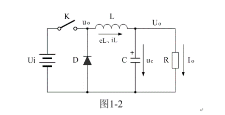 圖1-2是在圖1-1-a電路的基礎上,增加了一個整流二極管和一個LC濾波電路。其中L是儲能濾波電感,它的作用是在控制開關K接通期間Ton限制大電流通過,防止輸入電壓Ui直接加到負載R上,對負載R進行電壓沖擊,同時對流過電感的電流iL轉化成磁能進行能量存儲,然后在控制開關K關斷期間Toff把磁能轉化成電流iL繼續向負載R提供能量輸出;C是儲能濾波電容,它的作用是在控制開關K接通期間Ton把流過儲能電感L的部分電流轉化成電荷進行存儲,然后在控制開關K關斷期間Toff把電荷轉化成電流繼續向負載R提供能量輸出;D是整流二極管,主要功能是續流作用,故稱它為續流二極管,其作用是在控制開關關斷期間Toff,給儲能濾波電感L釋放能量提供電流通路。