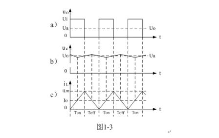 (3)當Ui < 2Uo時,即:濾波輸出電壓Uo大于電源輸入電壓Ui的一半時,或控制開關K的占空比大于二分之一時:在K接通期間,雖然流過儲能電感L的電流上升率(絕對值),小于,在K關斷期間,流過儲能電感L的電流上升率(絕對值)。但由于Ton大于Toff,(1-5)式中i(0)和(1-11)式中iLX均大于0,即:電感存儲能量每次均釋放不完。在這種情況下,流過儲能電感L的電流iL是連續電流,開關電源工作于連續電流狀態,輸出電壓Uo的紋波比較小,且濾波輸出電壓Uo大于濾波輸入電壓uo的平均值Ua。參看圖1-5。