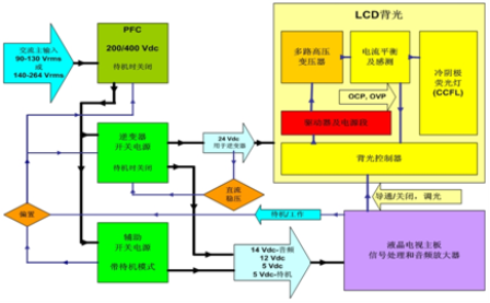 圖1:采用標準直流24 V逆變器的傳統液晶電視開關電源框圖。