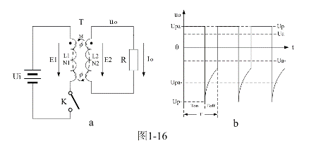 圖1-16-a是單激式變壓器開關電源的最簡單工作原理圖。圖1-16-a中,Ui是開關電源的輸入電壓,T是開關變壓器,K是控制開關,R是負載電阻。