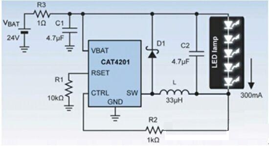 圖2說明了如何利用CAT4201從一個24V電源來驅動5只1W的LED。LED電流由外部電阻R1來設定。CAT4201降壓LED驅動器利用兩階段開關作業(yè)來提供精確的平均電流。在第一階段,位于內部的CAT4201 FET開關將SW端連接到地,使電流上升并對電感充電。