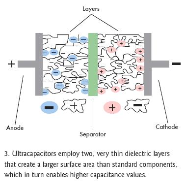 雙電層電容器(EDLC)正如它的字面意義那樣可以解決上述問題,它在相同的封裝內增加了第二個電介層,這個電介層與第一層在中間隔離物的兩邊并行工作(圖3)。EDLC也采用無孔電介質,如活性碳、碳納米管、炭黑凝膠,并選用導電聚合物,其存儲容量要比標準的電解材料高出許多。額外層和更高效電介材料的這種組合能使電容容量提高近4個數量級。