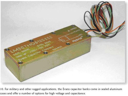 [page]EvansCapacitor公司的3STHQ3和3PTHQ3電容組器件則主要用于任務繁重的軍事應用,它將公司的三個THQ3混合電容集成進了一個陽極電鍍、環氧密封的鋁殼中,整個尺寸為4.47×1.59×1.09英寸(圖10)。針對更高的工作電壓,3STHQ3組可以串聯電容的方式提供以下四種產品:0.004F/160Vdc,0.0028F/200Vdc,0.0019F/250Vdc和0.0011F/300Vdc。
