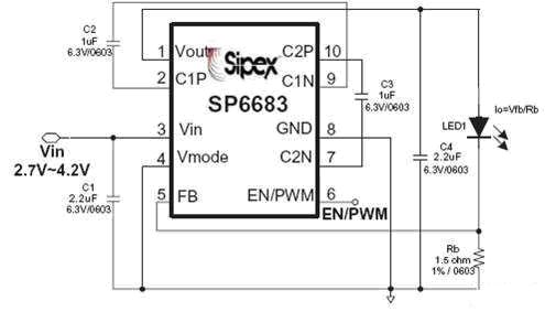 SP6682/3是采用恒流控制技術的電荷泵器件,FB反饋電壓為300mV,從而減少反饋電阻上的損耗,可選擇0603封裝電阻,負載端的效率比恒壓輸出方案的高,閃光的最大電流由公式2決定: