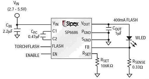 3)SP6686、SP6685和SP7685系列產品可提供300mA至1.2A閃光電流,適用于200萬像素及以上相機應用,圖3為該系列產品的典型應用電路: