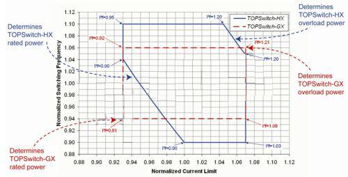 TOPSwitch-HX已解決了上述難題。TOPSwitch-HX引入額外的電路,并在最終測(cè)試中采用參數(shù)調(diào)整技術(shù),以控制開(kāi)關(guān)頻率與流限值平方的乘積的最大值和最小值,這在數(shù)據(jù)手冊(cè)中用一個(gè)新的參數(shù)來(lái)表征,即功率因數(shù)(I2f)。