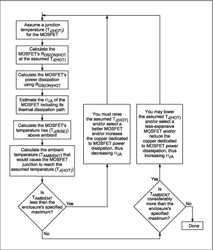 圖1.該流程圖展示了選擇各MOSFET(同步整流器和開關MOSFET)的迭代過程。在這個過程中,各MOSFET的結溫為假設值,兩個MOSFET的功率耗散和允許環境溫度通過計算得出。當允許的環境溫度達到或略高于我們所期望的機箱內最高溫度時(機箱內安裝了電源及其所驅動的電路),這個過程就結束了。[page]