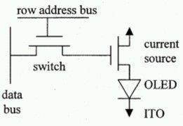 OLED像素的導通和尋址是由主動開關控制,這個開關則由薄膜晶體管擔任,它的制造技術和TFT液晶顯示器完全相同:電流源已經簡化到只需要一個MOSFET與OLED串聯。有些設計會使用電壓驅動架構,有些則采用電流驅動架構,所有設計都需要二至四顆,甚至更多的整合式薄膜晶體管。
