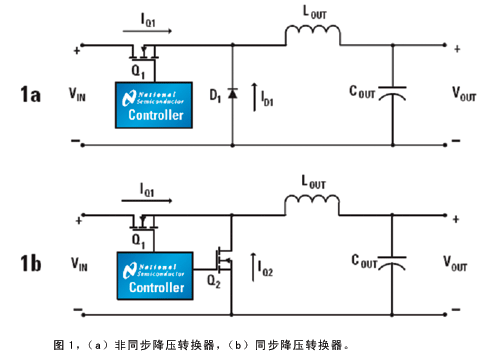 圖1是非同步和同步降壓轉(zhuǎn)換器的原理圖。非同步降壓轉(zhuǎn)換器使用FET和肖特基二極管作為開關(guān)器件(圖1a),當(dāng)FET打開時,能量傳遞到輸出電感和負(fù)載。當(dāng)FET關(guān)斷,電感中的電流流過肖特基二極管。如果負(fù)載電流高于輸出電感的紋波電流的一半,則轉(zhuǎn)換器工作在連續(xù)導(dǎo)通模式。