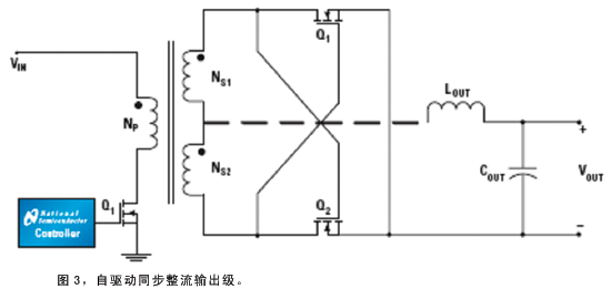自驅(qū)動方案是最簡單、直接的SR驅(qū)動方案(圖3),適合于那些在任何時間段內(nèi)變壓器電壓都不為零的拓?fù)浣Y(jié)構(gòu)。兩個SRFET可替代輸出整流二極管,次級繞組產(chǎn)生的電壓驅(qū)動SR的柵極。在大多數(shù)情況下,利用不同的變壓器線圈匝數(shù)比(NP∶NS1∶NS2)和正確選擇SRFET,相同的拓?fù)浣Y(jié)構(gòu)可以獲得更高或更低的輸出電壓。
