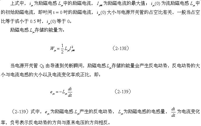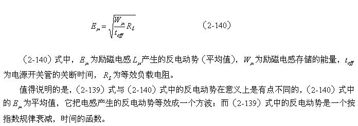 (2-140)式對于計算漏感 產(chǎn)生的反電動勢或其它電感產(chǎn)生的反電動勢同樣有效。漏感 中存儲的能量可根據(jù)(2-138)式求得;而流過漏感 的電流,對于反激式開關(guān)電源:可認(rèn)為與勵磁電流的大小基本相等,因?yàn)椋诜醇な介_關(guān)電源中,等效負(fù)載電阻等于無限大;對于正激式開關(guān)電源:可認(rèn)為與流過等效負(fù)載電阻的電流大小基本相等,因?yàn)椋谡な介_關(guān)電源中,勵磁電流相對于流過等效負(fù)載電阻的電流,很小。