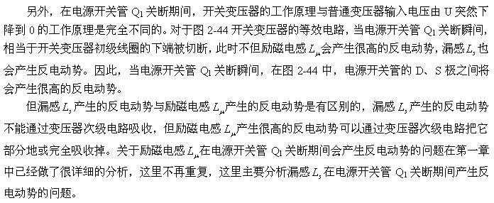 在圖2-46中,Cs1、Cs2都是分布電容,它們對于漏感 來說,既可以產(chǎn)生串聯(lián)振蕩,又可以產(chǎn)生并聯(lián)振蕩。在電源開關(guān)管Q1導(dǎo)通瞬間,漏感與分布電容主要是產(chǎn)生串聯(lián)振蕩,因?yàn)檩斎腚妷洪_始向串聯(lián)振蕩回路提供能量;在電源開關(guān)管Q1關(guān)斷瞬間,漏感與分布電容主要是產(chǎn)生并聯(lián)振蕩,因?yàn)槁└?必須要通過并聯(lián)回路釋放能量。在實(shí)際應(yīng)用中,漏感相對于勵磁電感 來說很小,因此如果不考慮漏感的作用,完全可以把Cs1、Cs2看成是一個分布電容。