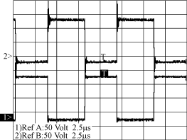 開關(guān)管S1和S的Uds波形如圖3所示,RefA為S管壓降波形,50V/div,RefB為S1管壓降波形,50V/div。電路此時工作在Vin=60V左右,S1和S的開關(guān)應(yīng)力大概為120V,D=0.5左右。圖4為變壓器輸出電壓,也就是同步整流管SR1和SR的驅(qū)動信號,正的部分為SR的驅(qū)動信號,負的部分為SR1的驅(qū)動信號。實驗所得波形和分析的波形基本吻合,只是在開關(guān)轉(zhuǎn)換瞬間,電壓有小尖峰,這是由電路的雜散參數(shù)引起的。該電路的工作效率經(jīng)過測量大約在90%左右,基本達到設(shè)計的要求。