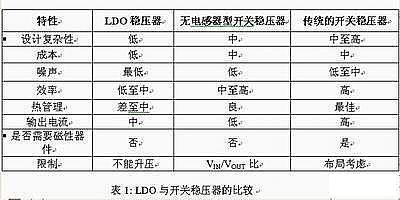 對于可滿足手機內部電源轉換需求的不同電壓穩壓器,我們必須認真考慮它們的優缺點(見表1)。目前有三種選擇:線性LDO穩壓器、無電感型開關穩壓器(亦稱為充電泵)以及傳統的開關穩壓器(基于電感器)。