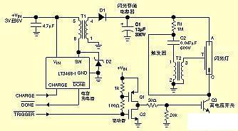 閃光電容器充電器基本上是一種具有某些特殊能力的變壓器耦合升壓轉換器。當其“充電”控制線為高電位時,穩壓器同步內部功率開關,使升壓變壓器產生高電壓脈沖。然后,這些脈沖再經整流和濾波,產生300V的直流輸出,其轉換效率高達80%。