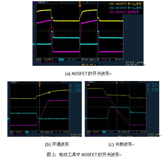 圖2為電動(dòng)工具中MOSFET(AOT500)的開關(guān)波形。