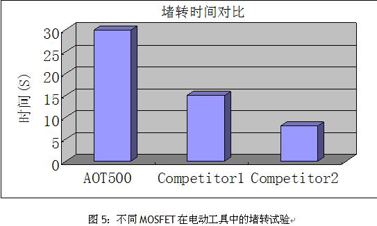 圖5為AOT500在電動(dòng)工具中的堵轉(zhuǎn)試驗(yàn)時(shí)間對(duì)比,可以看出,AOT500能承受的堵轉(zhuǎn)時(shí)間比其它的電動(dòng)工具常用的MOSFET要長很多,大大提高了電動(dòng)工具的可靠性。