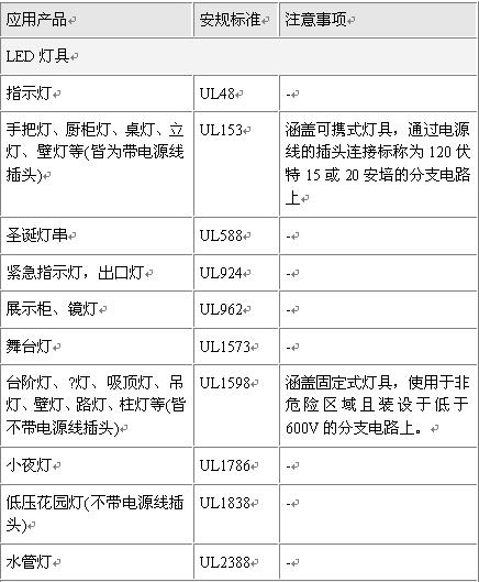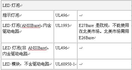 以下首先針對LED燈具、LED燈泡及LED驅動器等三種基本產品分類,及其分別沿用至各成品或零件時,所應參考的UL安規標準及應特別注意事項,以做為業者欲進行產品安規檢測的基本指南。不過該表僅供讀者參考,產品實際的歸類,仍須依產品的用途及其使用環境來決定。