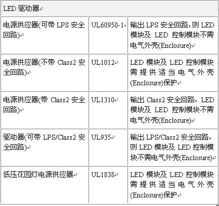4.其它要求:如LED電源、LED數組、LED模塊及LED控制模塊等安全及外殼要求等。LED的電源可以是下列標準所驗證的電源供應器,包括UL1012,UL1310及UL60950-1。基本上,LED數組、LED模塊及LED控制模塊只要位于LPS/Class2安全回路上,就沒有任何電氣外殼的要求。LED燈具對于電源輸出方式的規定為基本絕緣,與完全沒有隔離是一樣的。對于LED數組、LED模塊及LED控制模塊,如果使用的電源不用大到超過LPS/Class2,建議最好要符合LPS/Class2。反之,若使用的能量將大于LPS/Class2,則有沒有提供隔離一次側與二次側電源電路的絕緣,對塑料外殼的要求上,是沒有差別的。