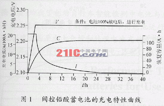 以國內外使用最多也最為普遍,研究分析也最為深刻的鉛酸蓄電池為例。請觀察一幅在研究閥控式鉛酸蓄電池技術方面,經常看到和用到的圖1。這里我們要說明的是,這幅圖是專家們拋開日常環境溫度變化對蓄電池充電過程的影響,用經過改進的恒壓限流方法對蓄電池充電所獲得的。因是恒壓限流充電方式,所以代表電流變化的I線,起始段有一小段是限流值。代表電壓的V線起始段是一段很陡的上升線,更確切地講由于充電器的限流作用應是電壓的下跌線。
