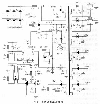 +15V電源和-15V電源對控制電路電源精度要求較高,但因為共用同一個變壓器很難通過PWM實現(xiàn)反饋控制來穩(wěn)壓。為獲得高品質(zhì)的控制電源,應(yīng)用線性穩(wěn)壓芯片7815和7915(如圖1所示)構(gòu)成了復(fù)合式開關(guān)穩(wěn)壓電源。為防止輸出在輕載或空載時的電壓升高,在5 V整流輸出端并聯(lián)一個100Ω的負(fù)載電阻。