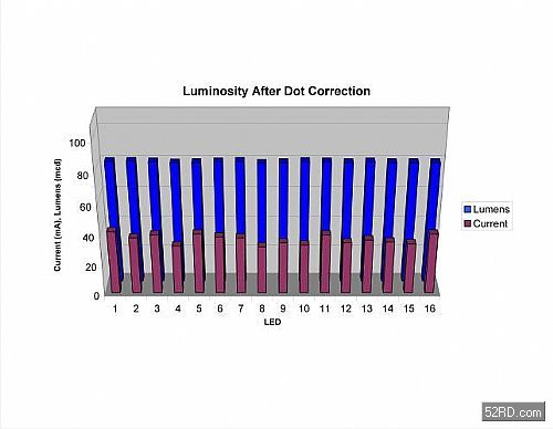 TLC5940之類的元件最多能驅動16顆LED,每顆元件只需要一顆電阻來設定最大電流值。選擇此電阻時應確保其設定之電流足以讓最暗的LED發出80毫燭光,LPE675元件資料表顯示它需要43mA的驅動電流才能發出80毫燭光。設計人員可在安裝時先測量LED在43mA滿電流時所發出的亮度,然后產生類似圖1的亮度直方圖。圖中第一排資料是以mA為單位的LED電流值,第二排則是以毫燭光為單位的LED亮度值。從圖中可看出LED亮度在未采用像點修正功能時最多相差±10%,這種差異程度是高階顯示器無法接受的。驅動元件可以根據直方圖所示資料個別調整、或是「像素修正」每顆LED的電流,使它們最后得以產生均勻亮度;例如它必須將滿電流下的LED1亮度從83毫燭光調整至80毫燭光。TLC5940提供6位元(64階)像點修正功能,其中每一階都相當于滿刻度的1.56%。