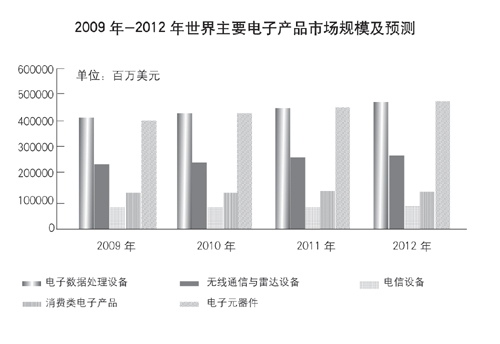 未來3年內,電子數據處理設備、電子元器件、無線通信產品和消費類電子產品份額仍將占據世界電子產品份額的前4位。2009年上述4種電子產品所占比例分別是28.18%、27.99%、16.37%、9.20%。其中電子數據處理設備和消費類電子產品所占份額分別比2008年提高了0.77%和0.33%。未來3年內,世界主要電子產品所占份額的比重基本保持穩定,電子元器件所占比重略有增加,預計將由2009年的27.99%增加到2012年的28.89%,電子數據處理設備將由28.18%增加到28.43%。