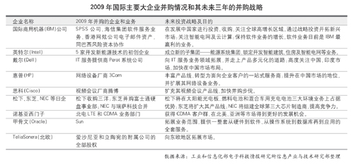 2009年,世界主要IT企業為應對國際金融危機,紛紛通過并購戰略整合優勢資源,開拓新興市場,實施產品多元化發展,從而提升行業戰略地位和自身的競爭力。未來3年這種發展態勢仍會繼續。