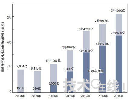 5年內成長90倍——鋰離子充電電池市場正處于大轉型期。在被電動車(EV)采用后,預期鋰離子充電電池市場在未來5年內將超越3萬億日元。技術發展的激烈競爭已展開,一系列新加入公司使得情況更為熱鬧。