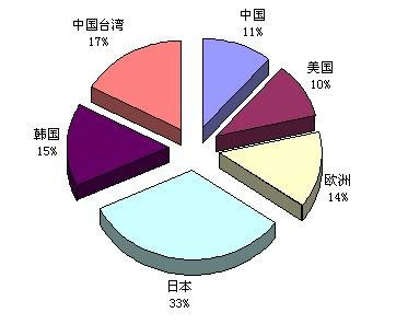 如果以地區(qū)別來觀察,日本全球的產(chǎn)值仍居冠,臺灣廠商以市占率17%排名第二。而韓國的市占率由2008年的9%竄升到2009年的15%,位居全球第3。