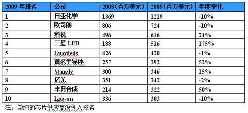 以個別廠商營收觀察,較早切入大尺寸背光市場的LED供應(yīng)商,營收都在金融 海嘯中逆勢成長,例如韓國SamsungLED、首爾半導(dǎo)體 、日本廠商豐田合成等廠商。在營收排名上,2009年日亞化仍居全球第1名。其次是OSRAMOpto.與CREE等傳統(tǒng)LED大廠,臺灣廠商光寶、億光也都入榜前10名。