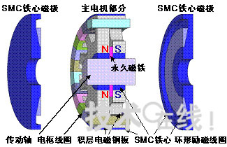 為了有效協調兩種磁鐵,名古屋工業大學采用了SMC(Soft Magnetic Composites=軟磁性復合材料)鐵心。SMC鐵心是對鐵粉等帶有磁性的粒子表面被覆絕緣層,并壓縮成形和經熱處理而制成。能夠以低成本量產和成形具有復雜三維構造的磁性部件。