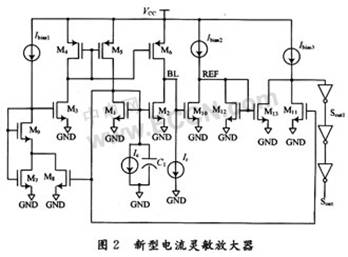 靈敏放大器的工作目的是通過放大位線上微小信號的變化而讀取存儲單元中的數(shù)據(jù)。一般可以分為電流型靈敏放大器和電壓型靈敏放大器兩種。由于電流靈敏放大器直接探測輸入電流的變化,可以克服電壓型靈敏放大器速度較慢、低工作電壓下小信號電壓增益減少等缺陷,因此電流靈敏放大器受到越來越多的關(guān)注。