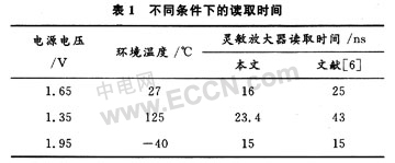 表1是該電流靈敏放大器在不同電源電壓和環(huán)境溫度下的讀取時間。從表1中可以看出在較低電源電壓和惡劣環(huán)境下該電流靈敏放大器仍然有比較好的性能。表1還把本文的電流靈敏放大器的仿真結(jié)果與參考文獻[6]所仿真的結(jié)果進行了對比,可以看出在本文所設(shè)計的電流靈敏放大器在某些情況下有更快的讀取速度。