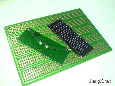 圖7是制成后的太陽能供電板,制成后就可以給一些小東西供電了,比如手電筒、收音機之類的。接幾個白色高亮LED,就成為一個太陽能LED手電筒,圖8是太陽能供電板點亮高亮LED的情景。