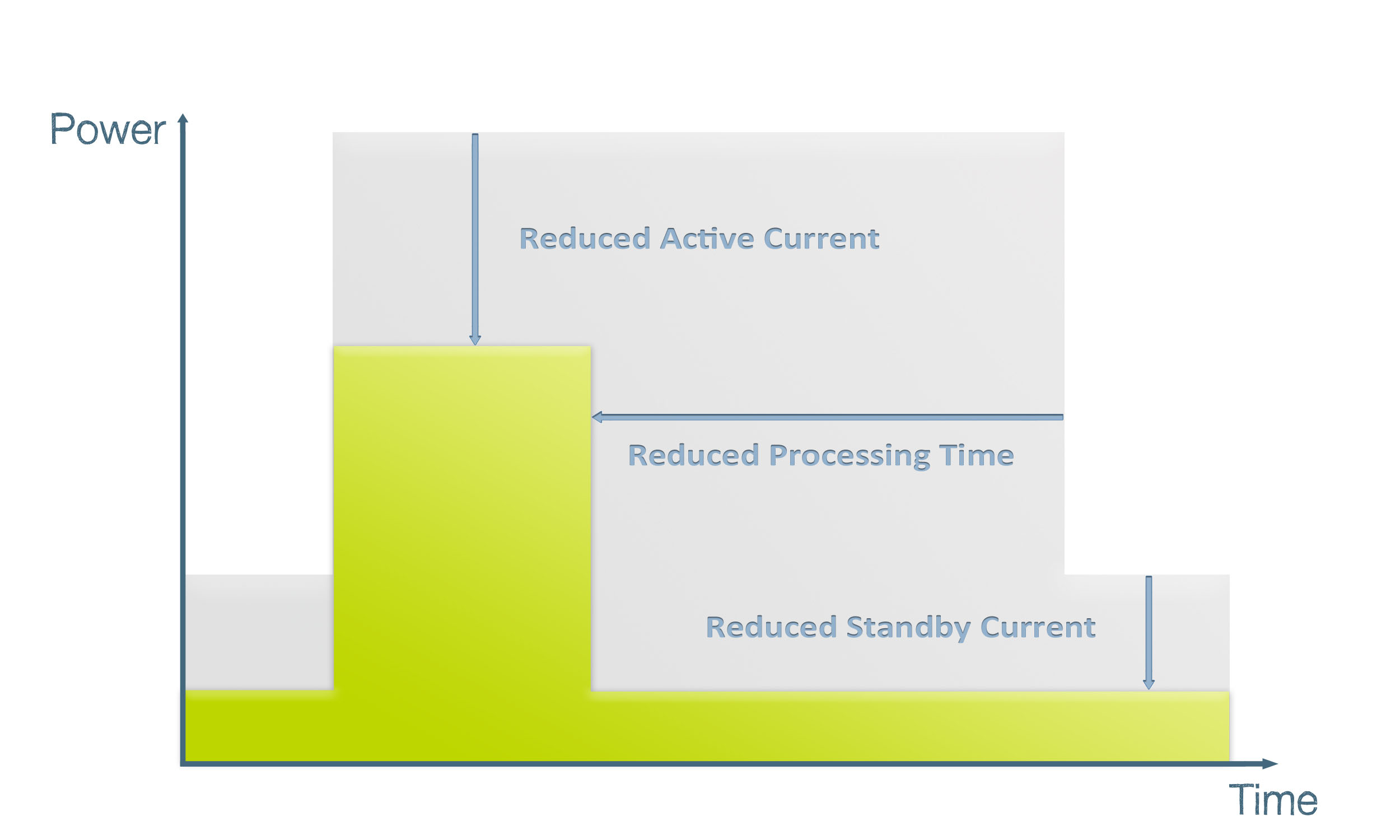 圖2. 一個節能MCU內核可通過完整的喚醒/操作/返回睡眠周期節省幾個不同區域的能量。藍色區域表示一個更強大的32位內核完成任務所節省的能量,所需的周期比一個8位內核需要的少,在活躍和睡眠模式下消耗的電流也較少。
