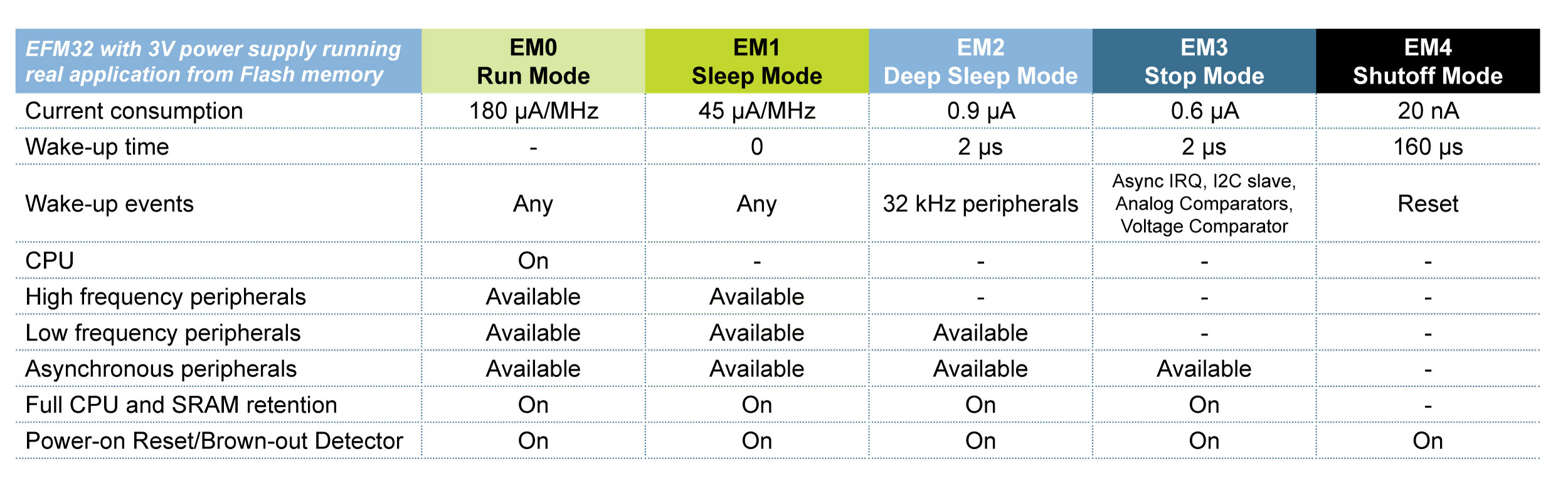 圖3. EFM32 Gecko微控制器的關鍵屬性是它提供給用戶的能源模式選擇
