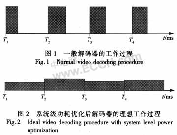 式中:T為工作時(shí)間;C是與系統(tǒng)負(fù)載電容相關(guān)的系數(shù);Vdd和f分別為供電電壓和運(yùn)行頻率。對(duì)于同樣的負(fù)載,根據(jù)式(1),很容易推導(dǎo)出,當(dāng)負(fù)載均勻分布于時(shí)間間隔T內(nèi)時(shí),能量效率是最優(yōu)的。所以,對(duì)于面向多媒體應(yīng)用的SOC低功耗系統(tǒng)級(jí)優(yōu)化而言,其主要思想就是如何根據(jù)具體應(yīng)用的需要,在當(dāng)前可用的IP及其配置中,尋求一套最優(yōu)化的組合,使得系統(tǒng)負(fù)載能均勻分布在給定的時(shí)間約束內(nèi)。圖2給出的則是設(shè)計(jì)者進(jìn)行系統(tǒng)級(jí)功耗優(yōu)化的理想狀態(tài),雖然在實(shí)際應(yīng)用中該狀態(tài)永遠(yuǎn)無(wú)法達(dá)到,但是可以在設(shè)計(jì)過(guò)程中無(wú)限逼近這一狀態(tài)。