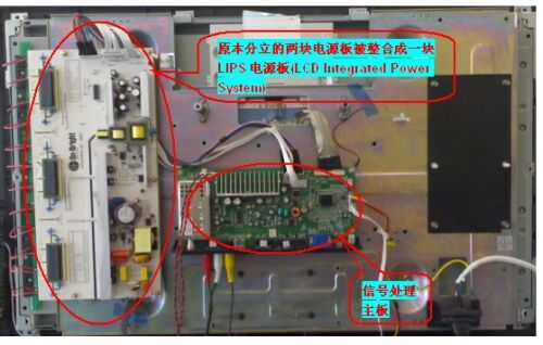 圖2:傳統式LCDTV內置信號處理、AC/DC電源、DC/AC電源三塊PCB板。