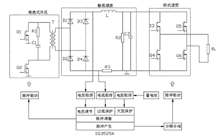 本逆變器輸入端為汽車蓄電池(+12V,4.5Ah),輸出端為工頻方波電壓(50Hz,220V)。其系統主電路和控制電路框圖如圖1所示,采用了典型的二級變換,即DC/DC變換和DC/AC逆變。12V直流電壓通過推挽式變換逆變為高頻方波,經高頻升壓變壓器升壓,再整流濾波得到一個穩定的約320V直流電壓;然后再由橋式變換以方波逆變的方式,將穩定的直流電壓逆變成有效值稍大于220V的方波電壓,以驅動負載。為保證系統的可靠運行,分別采集了DC高壓側電壓信號、電流信號及蓄電池電壓信號,送入SG3525A,通過調整驅動脈沖的占空比或關斷脈沖來實現電壓調節、過流保護及欠壓保護等功能。